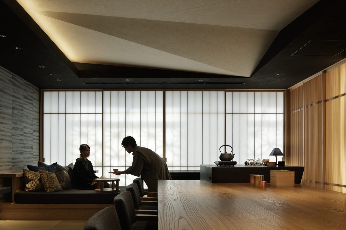 Every floor features a common lounge that is exclusive to guests staying on that floor. Most activity takes place in the ochanoma--a lounge that is seamlessly connected to every room on the floor via a tatami-matted corridor. Like in ochanoma at classic ryokans, a wide selection of refreshments--seasonal teas and confectionery during the day--are set out for guests to enjoy at different hours of the day. Guests are encouraged to treat this space as their own living room, where they may read a book, do some work, or relax and pass the time.