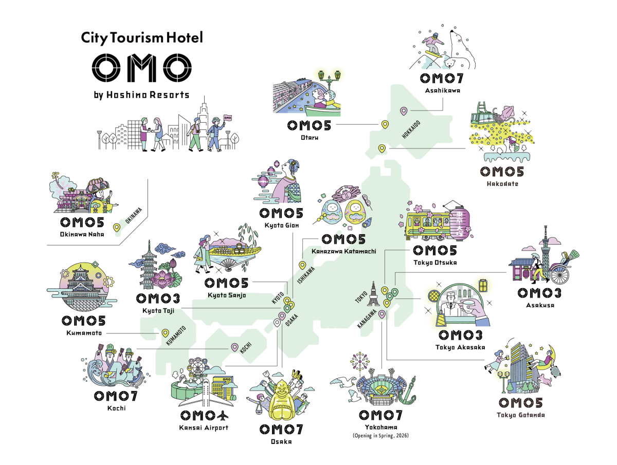 OMO is Hoshino Resorts' brand of "city-center" hotels across Japan that elevate your excitement. These are new-sensation hotels where staff who deeply love their city collaborate with local residents. Guests encounter unexpected charms and unknowingly become fond of the city itself. Currently, there are 16 OMO properties.